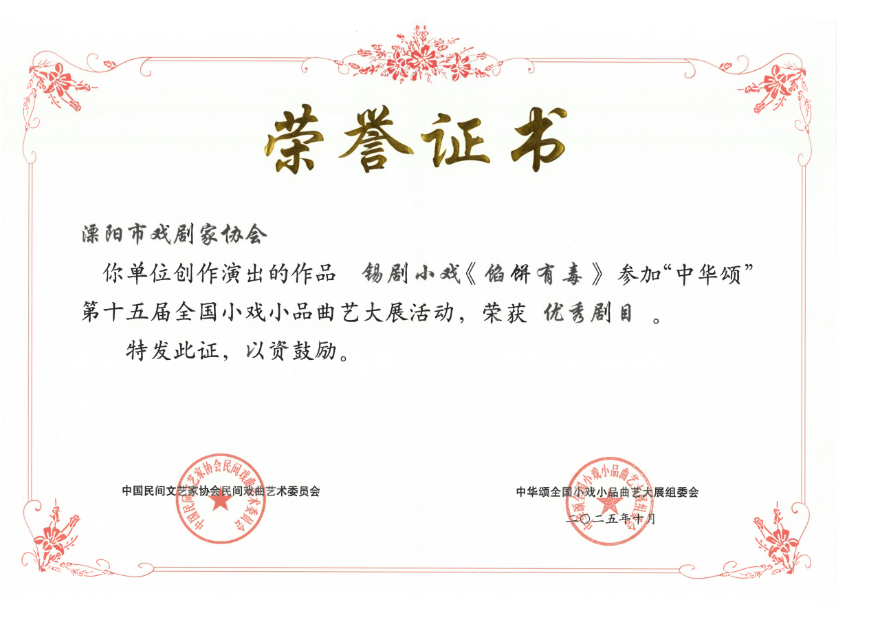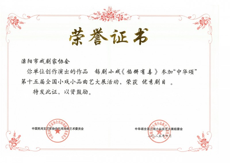 近日,“中华颂”第十五届全国小戏小品曲艺大展在北京市丰台区文化馆举办。溧阳市戏剧家协会创排的锡剧小戏《馅饼有毒》,荣获“中华颂”第十五届全国小戏小品曲艺大展“优秀剧目”奖。