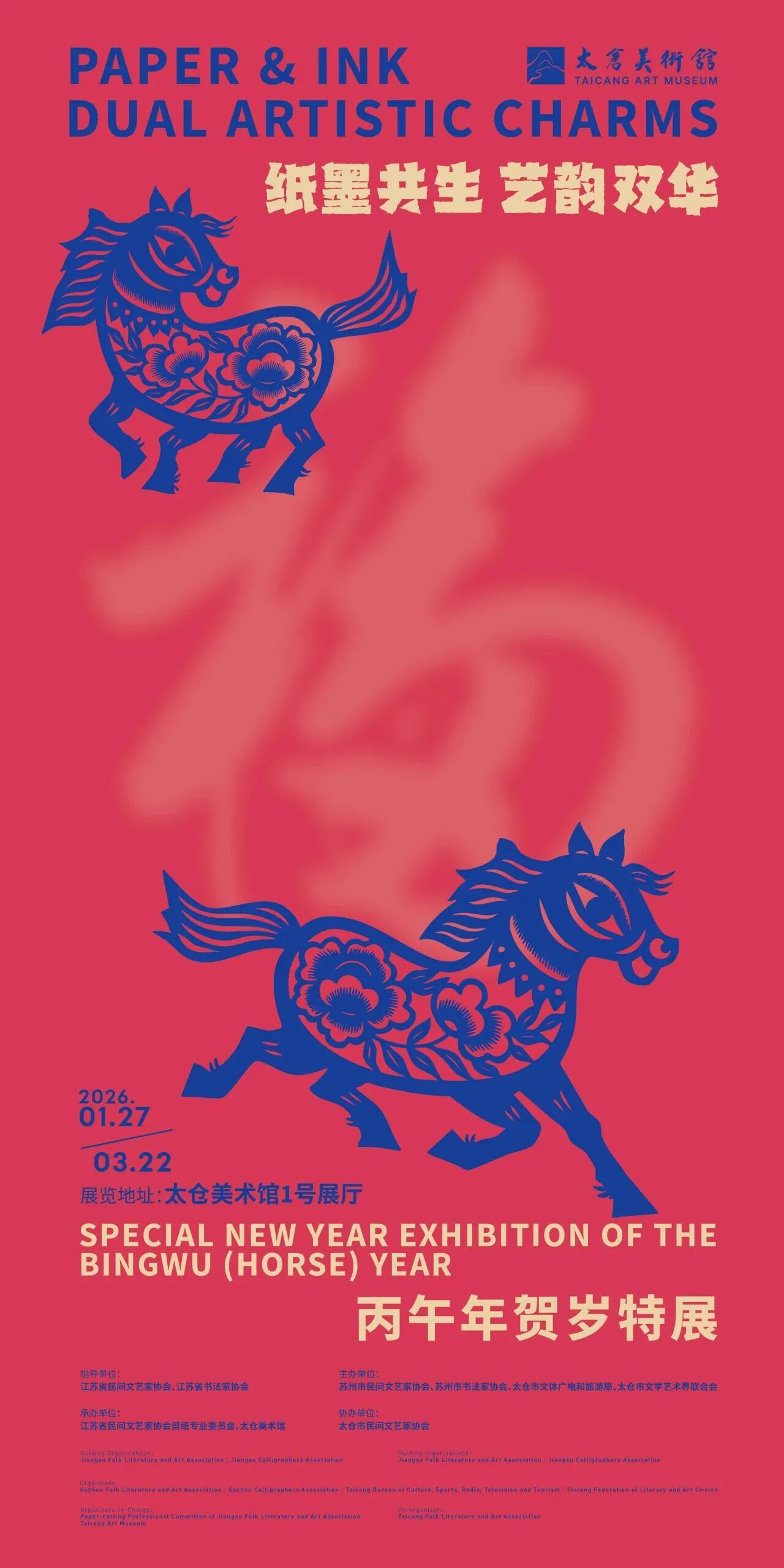 本次贺岁特展由江苏省民间文艺家协会、江苏省书法家协会指导,苏州市民间文艺家协会、苏州市书法家协会携手太仓市文体广电和旅游局、太仓市文学艺术界联合会联合主办,设「镂月裁云・剪下乾坤」「春风入墨・笔颂吉祥」「纸墨对话・和合共生」三大展区,融合剪纸、书法等艺术形式。