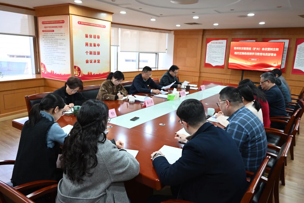 3月9日下午,常州市文联召开党组(扩大)会议暨树立和践行正确政绩观学习教育动员部署会,深入学习贯彻习近平总书记重要论述及中央、省、市委部署要求,推动学习教育在文联系统落地见效。市文联党组书记、主席沈玉俊,党组成员、副主席蒋志文,党组成员、副主席蒋小萍,秘书长、四级调研员张怡,文联机关和下属单位全体党员、干部参会。会议由沈玉俊主持。